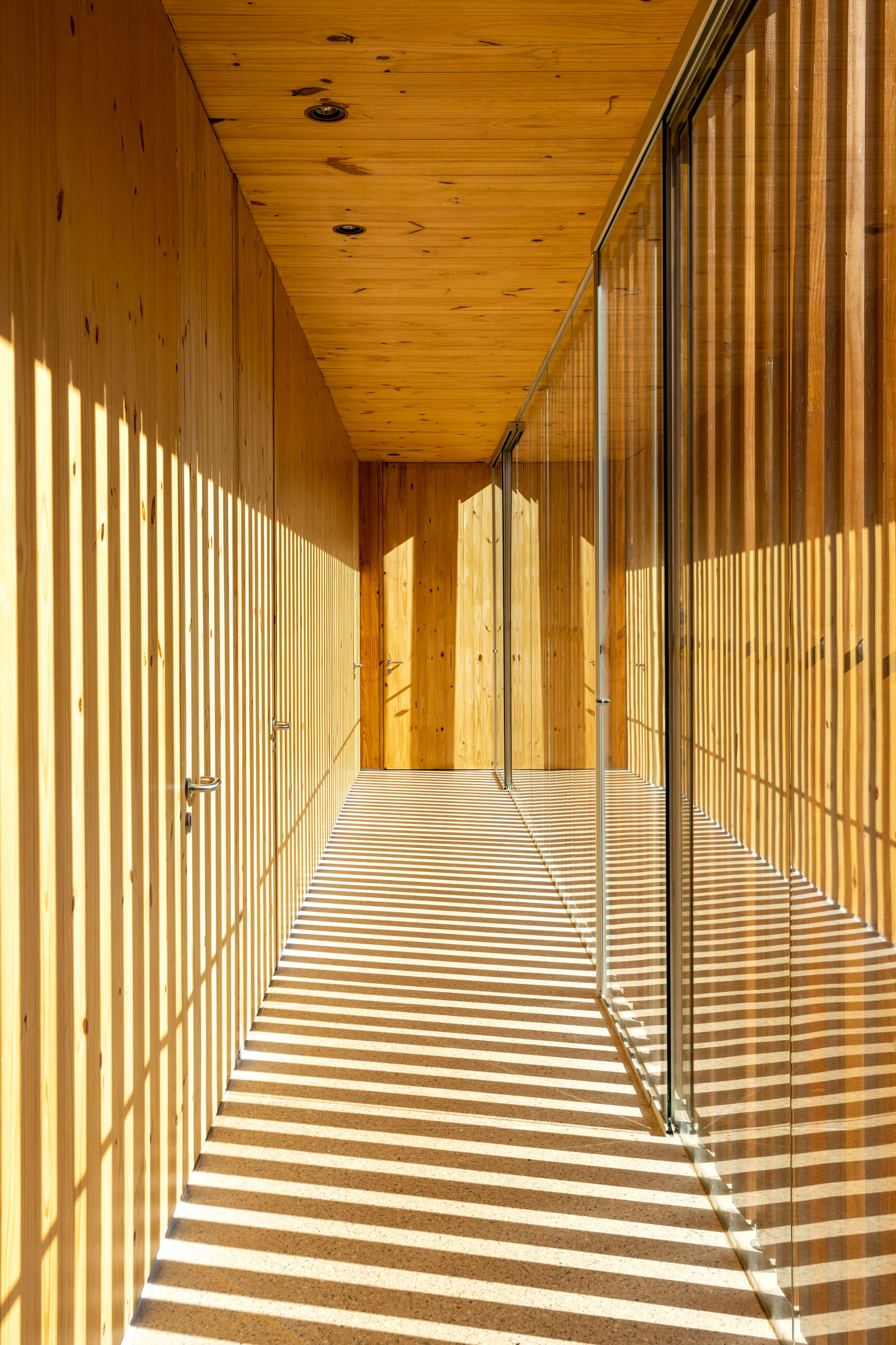 se configura por painéis de CLT como paredes estruturais e cobertura de MLC. Além disso, a volumetria central