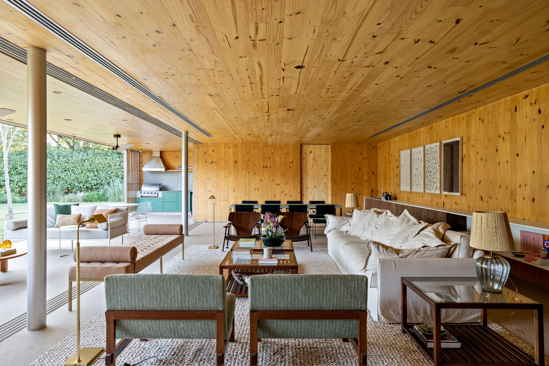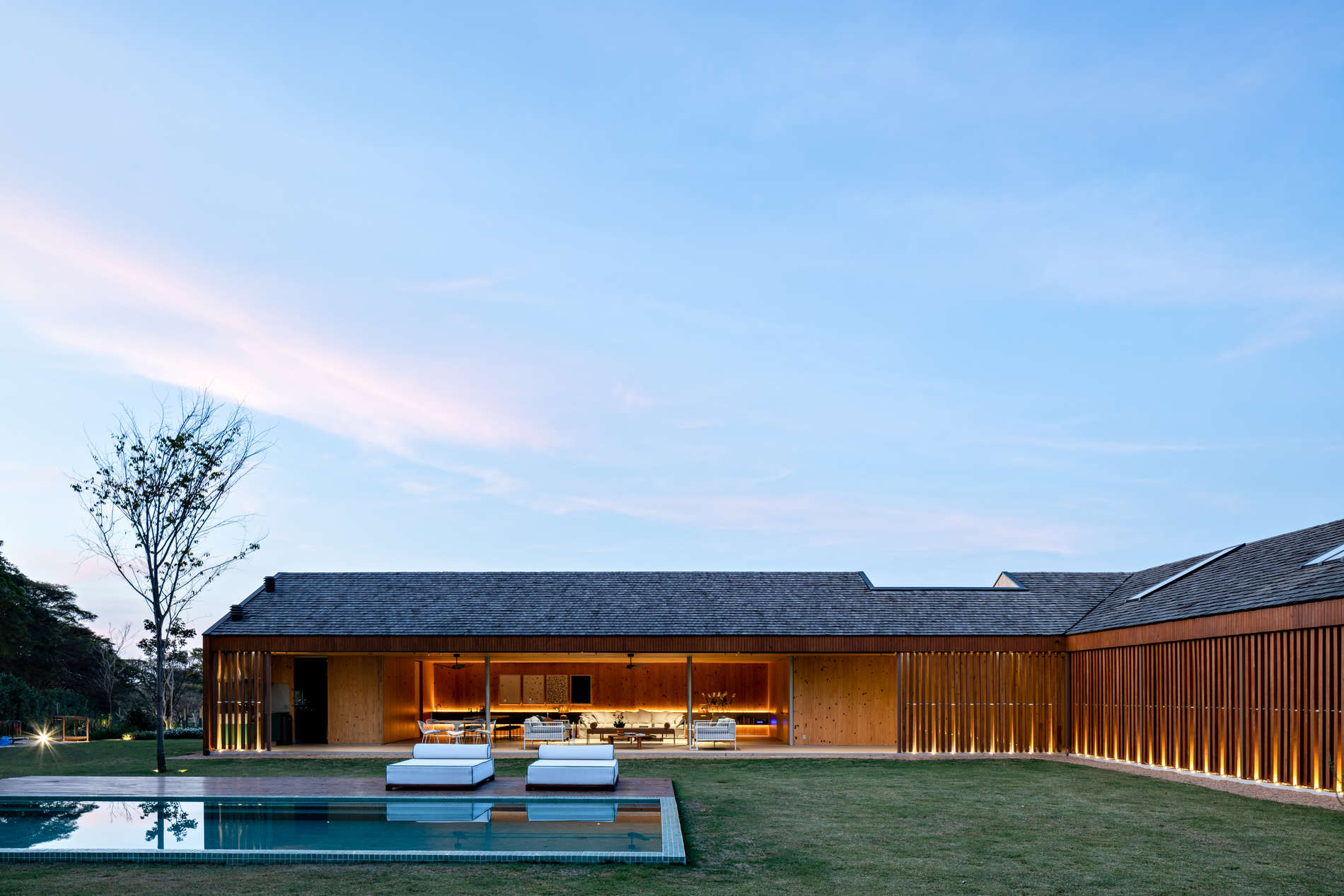 são revestidos com fachada ventilada de madeira e na cobertura, a residência recebe telhas do tipo taubilha.