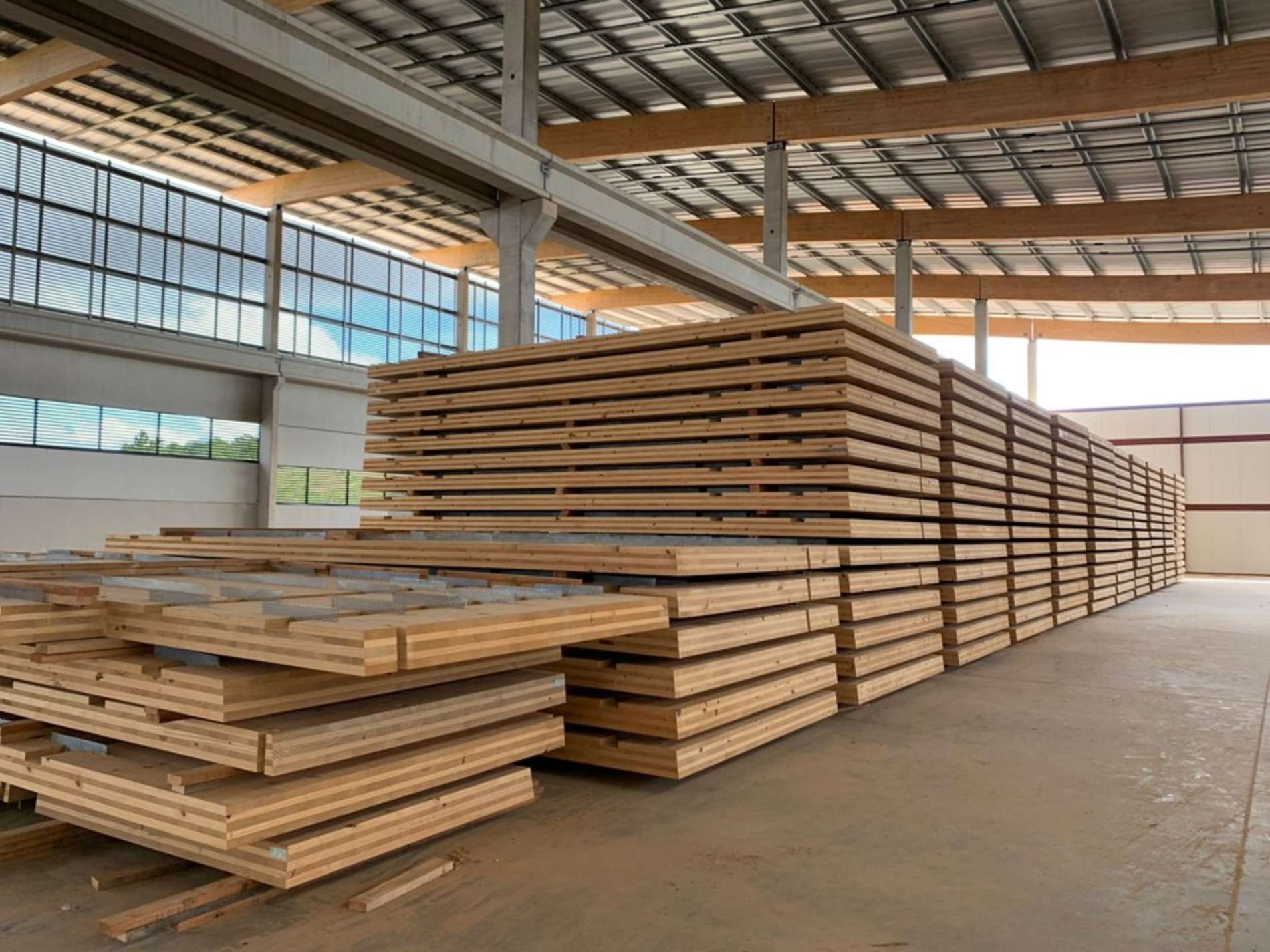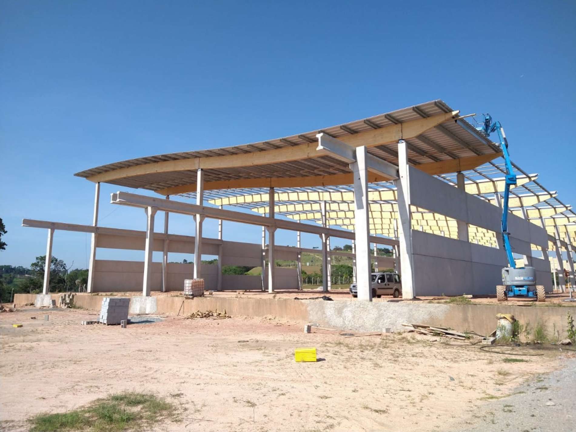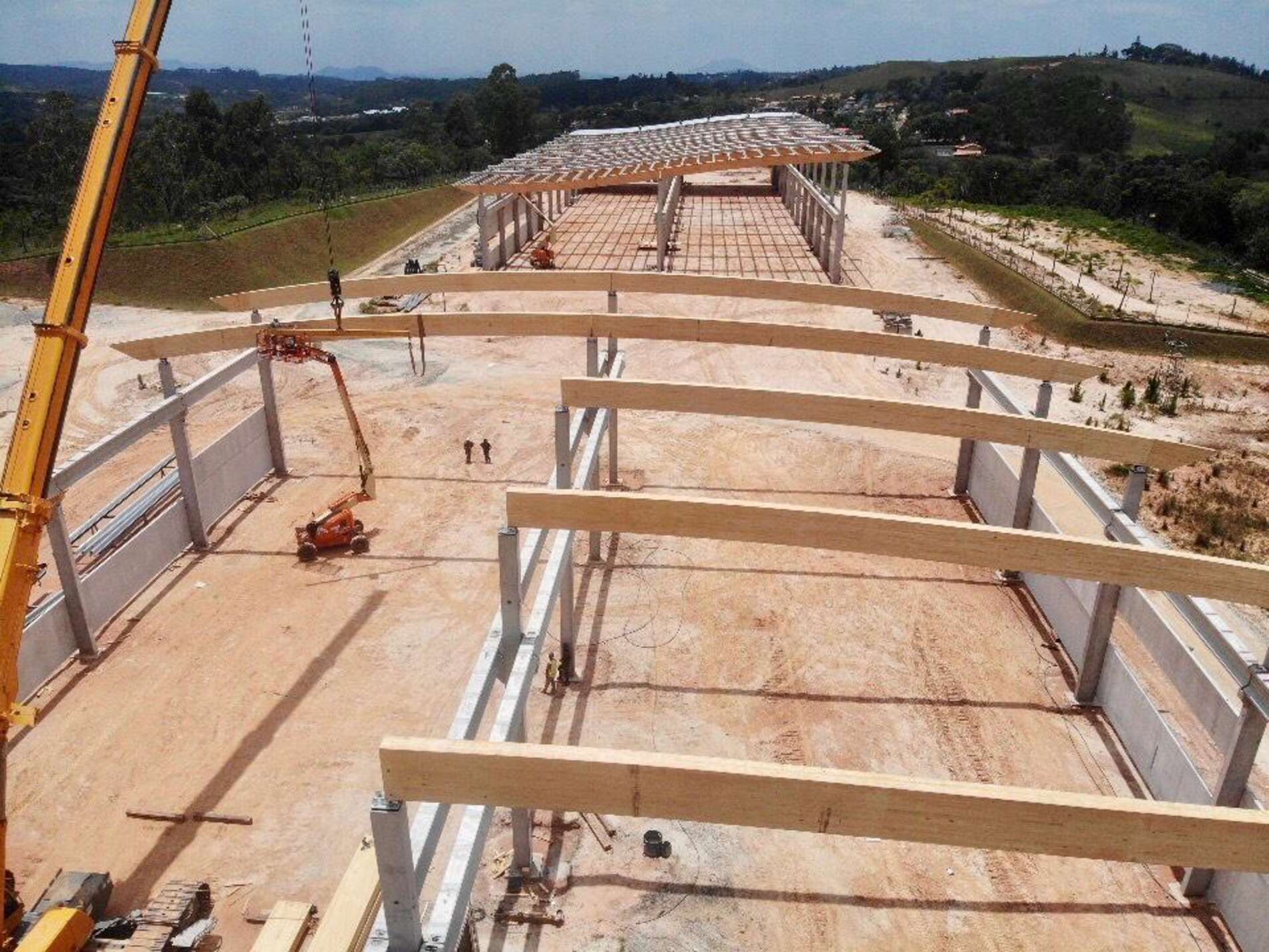 de concreto, vigas curvas de MLC, terças metálicas e telhas termoacústicas. As vigas de MLC curvas vencem vãos