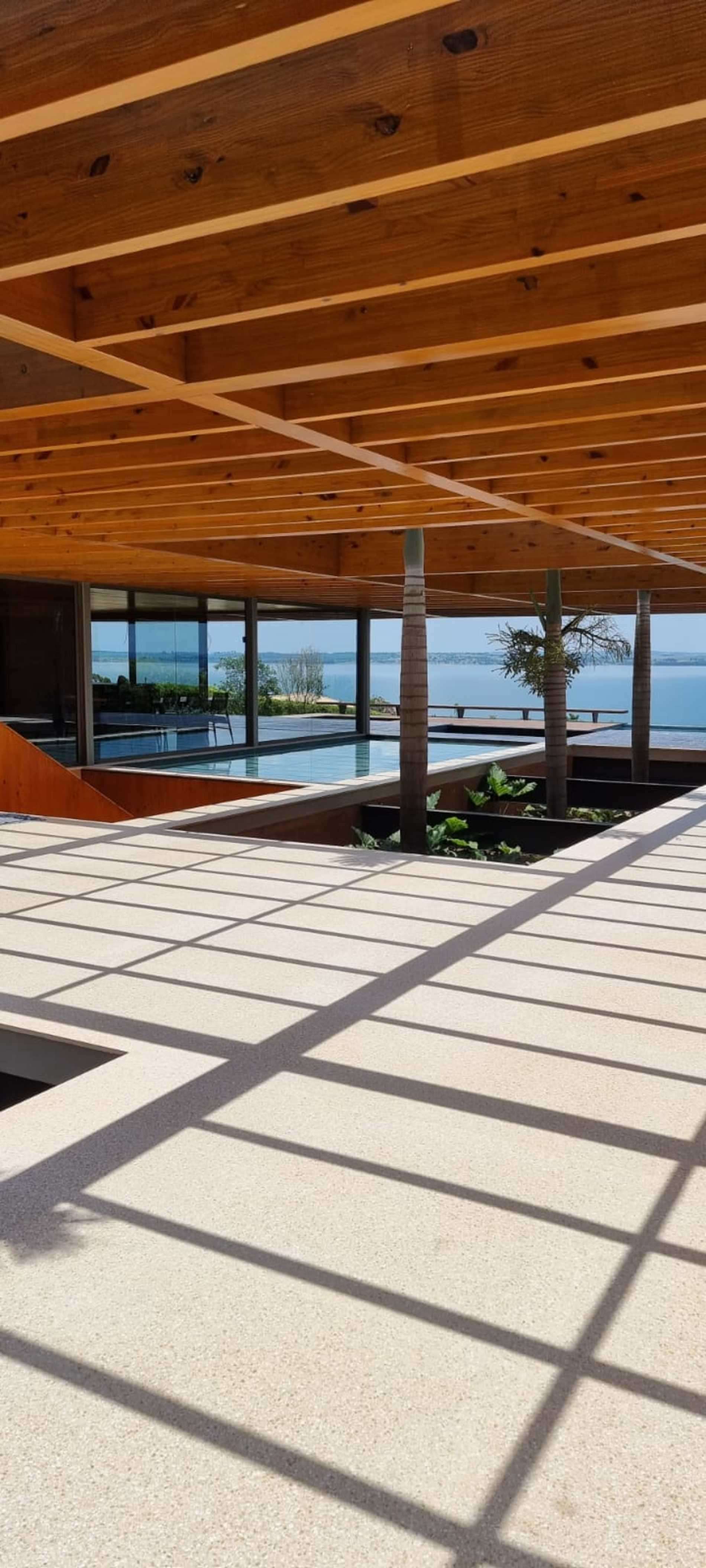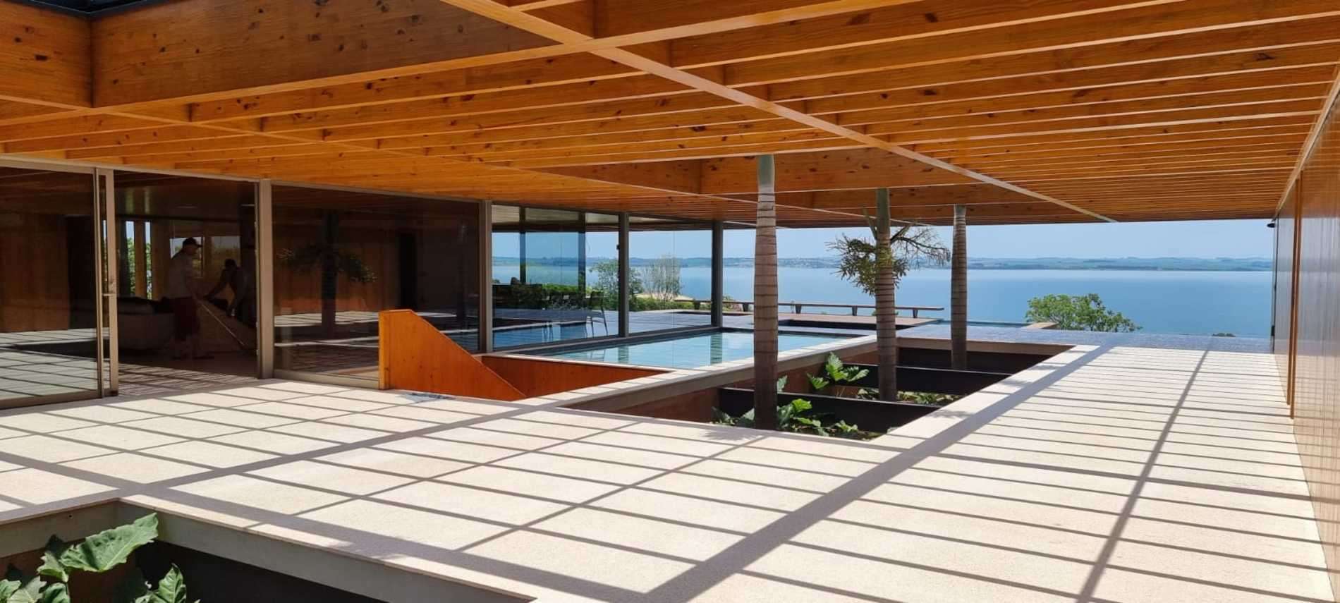 Estrutura: estrutura composta por paredes de CLT estruturais, lajes de cobertura de CLT, brises e cobertura de MLC.;