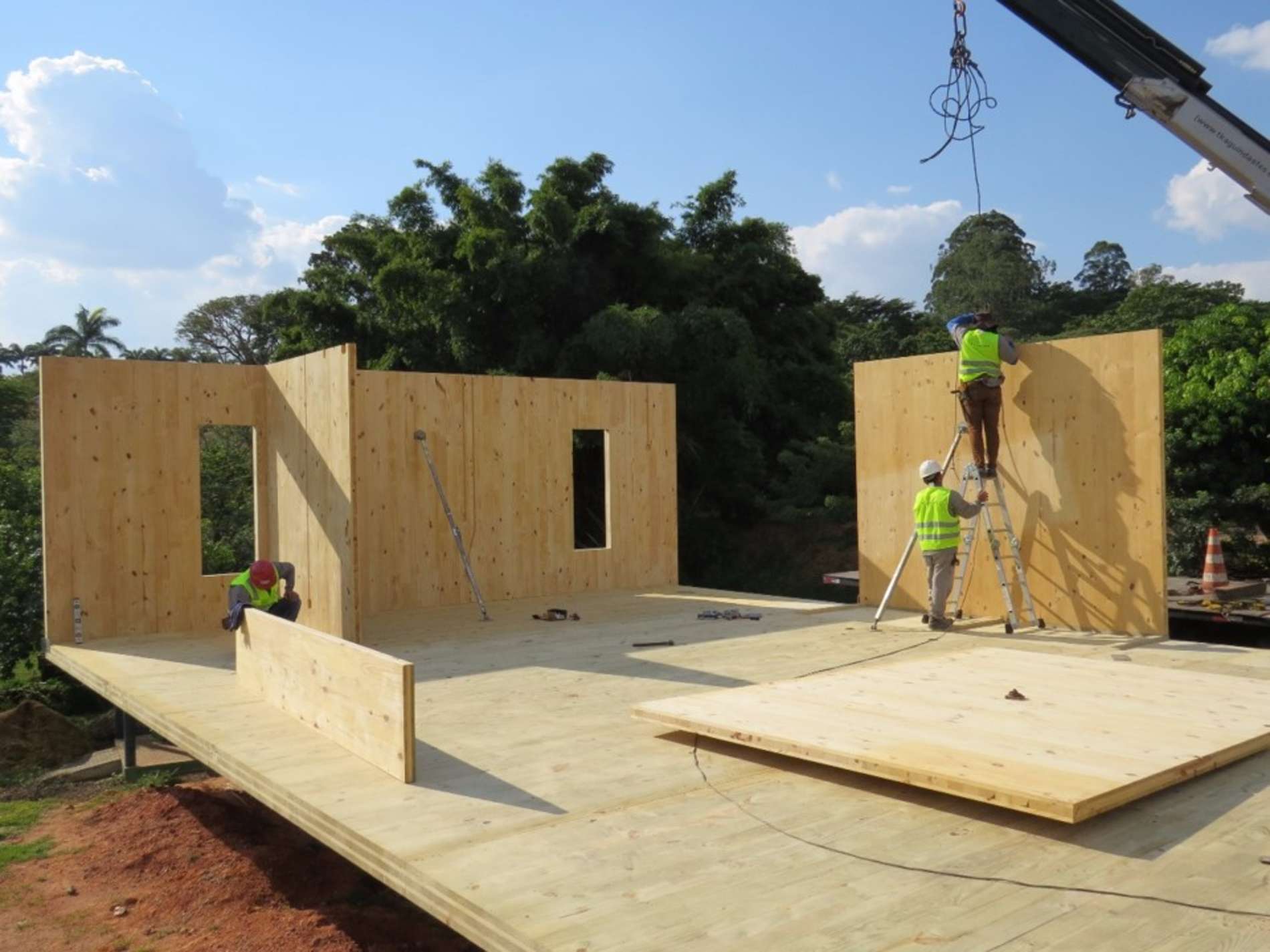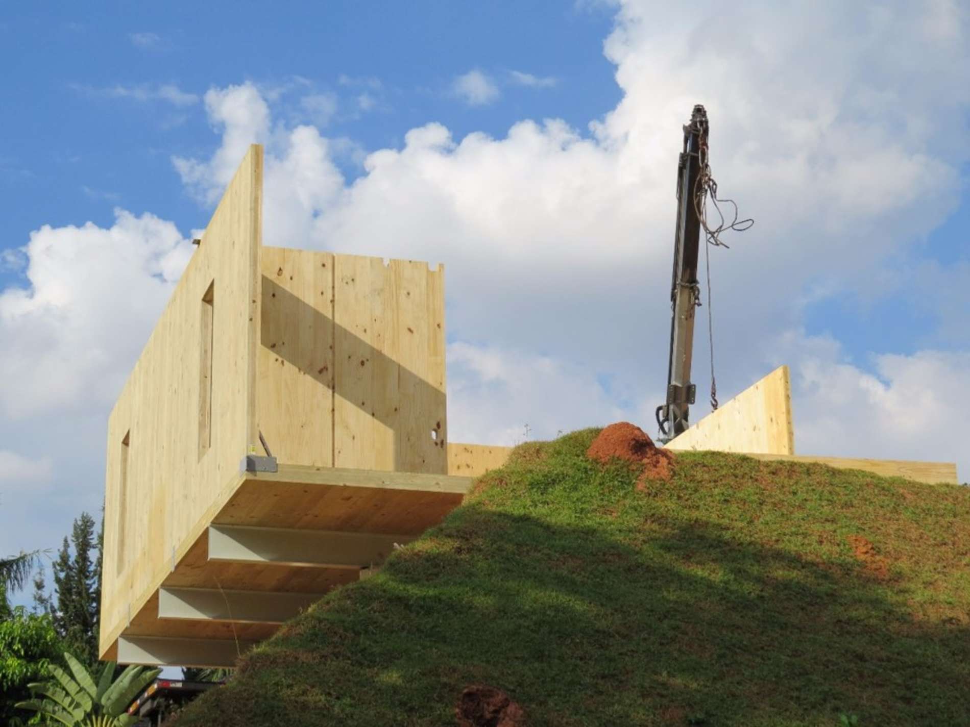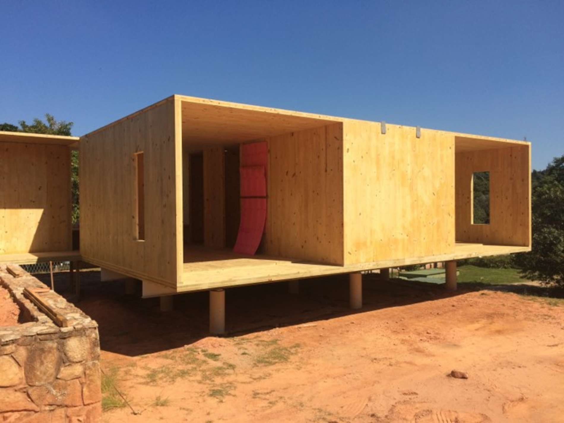 Estrutura: estrutura composta por painéis de CLT atuando como pares estruturais, lajes de piso e de cobertura, sustentadas por vigas metálicas invertidas;